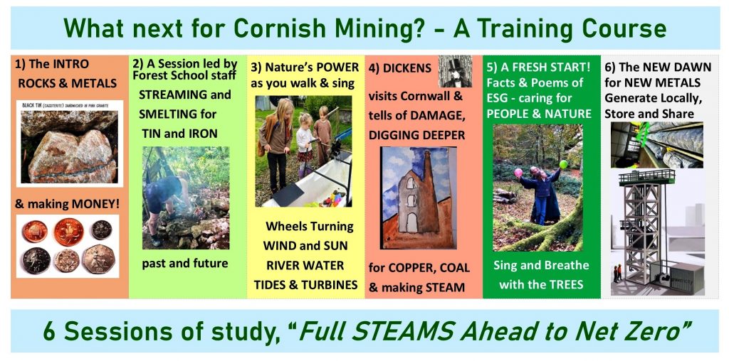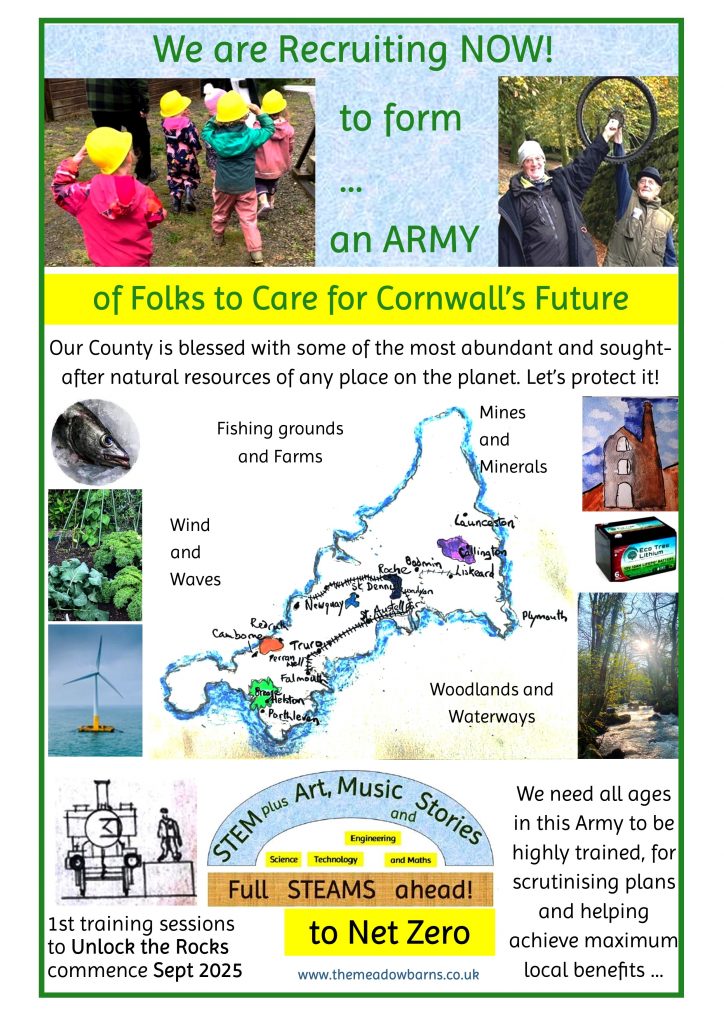 3. I care about the need for enjoyable STEM learning (Science Technology Engineering and Maths), for all ages but especially the very young. This is where my Arts, Music and Stories can bring things to life, in the method about Mining and Sustainable Energy Systems, called ‘Full STEAMS Ahead to Net Zero‘. In the Summer of 2025, we were celebrating the Joy of Stories at Meadow Barns, explaining answers to the question, ‘What’s the Future 4 Cornish Mining?’ The full course content and final certificate is supported by top organisations in the world of future mining – Imerys British Lithium, Exeter University/Camborne School of Mines and many colleagues in the Cornish Mining and Geo-Resources Alliance. But if that sounds a bit stiff and starchy, nothing could be further from the truth. It is loads of fun, for all ages!